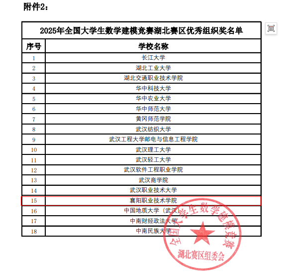 11月10日,2025年全国大学生数学建模比赛的成绩正式揭晓。在公共课部数学研究室的精心指导下,由来自汽车工程学院、信息技术学院、农学院、商学院的18名学生组成的6支参赛队伍,最终在激烈的角逐中,全部获奖,并荣获湖北赛区优秀组织奖,其中荣获全国一等奖1项、省一等奖3项,省二等奖1项,省三等奖1项,获奖率稳居全省首位。