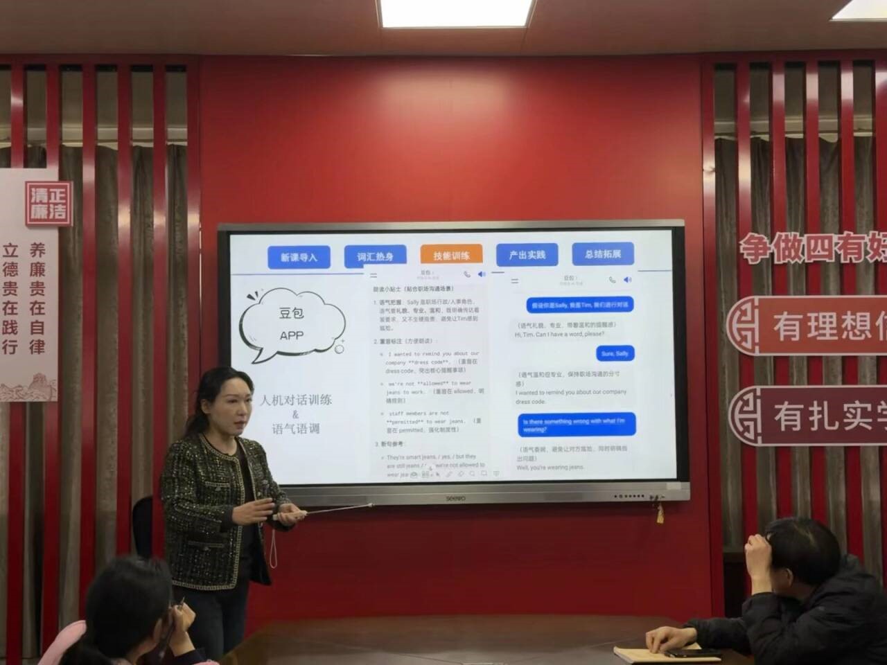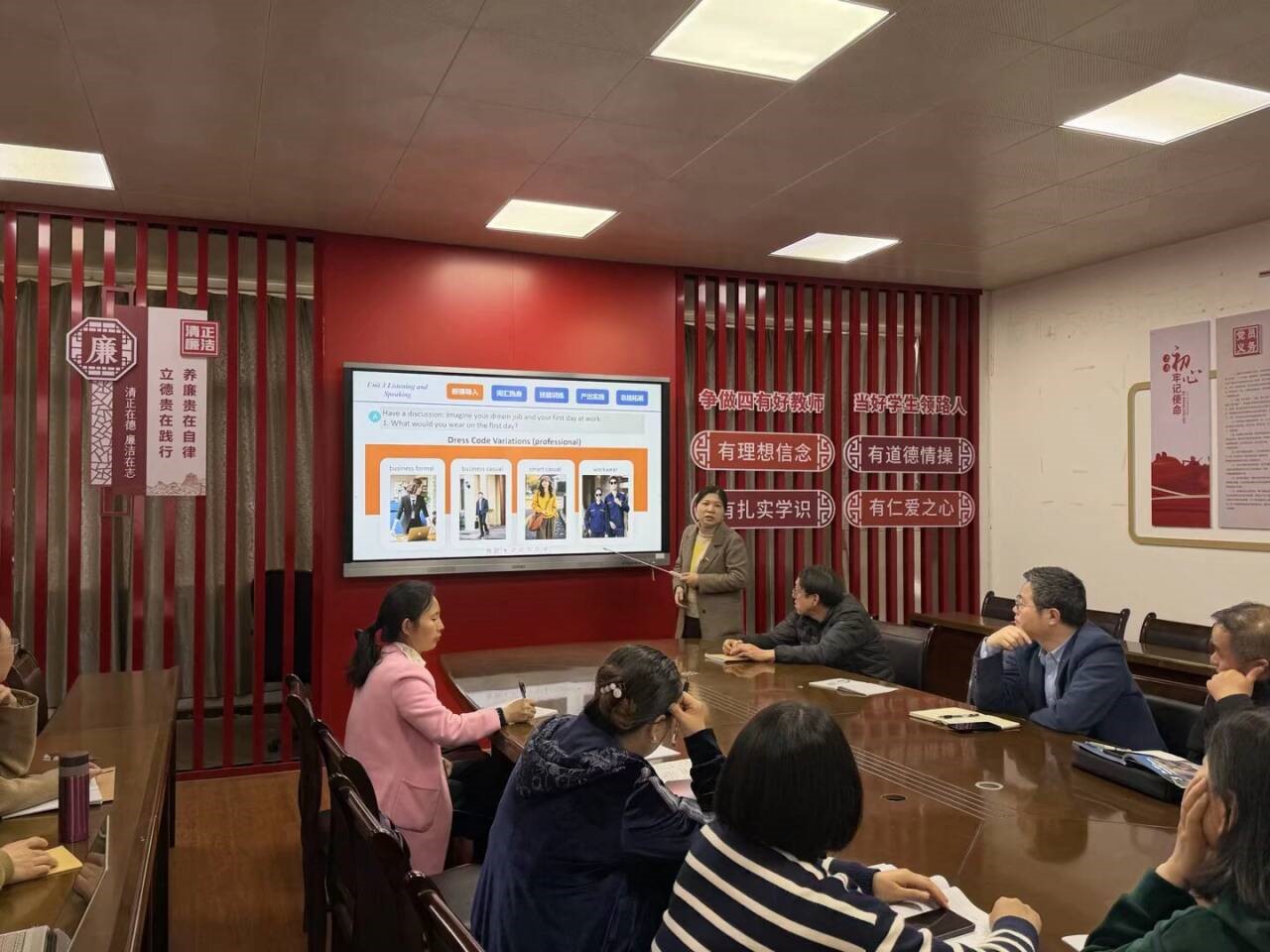 本次教研围绕高职第三单元听说课“Getting to know the dress code”展开,各位教师依次进行说课展示。大家立足教材与学情,从教学目标、重难点、教学流程、课堂活动设计、信息化手段应用等方面分享个性化教学思路,在情境创设、文化渗透、课堂互动、AI技术运用等方面各有亮点,充分展现了“同一内容、不同设计”的同课异构教学特色。说课结束后,教师们围绕教学设计展开深度研讨,相互点评、取长补短,共同探讨优化课堂的有效路径。