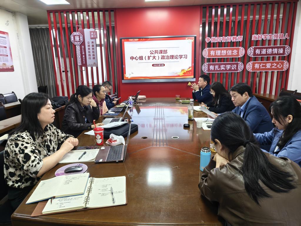 2025年9月15日上午,公共课部理论学习中心组在博学楼三楼会议室举行2025年第9次理论学习会。公共课部中心组成员、副科级干部、研究室主任参加学习,由党总支书记陈建波主持。