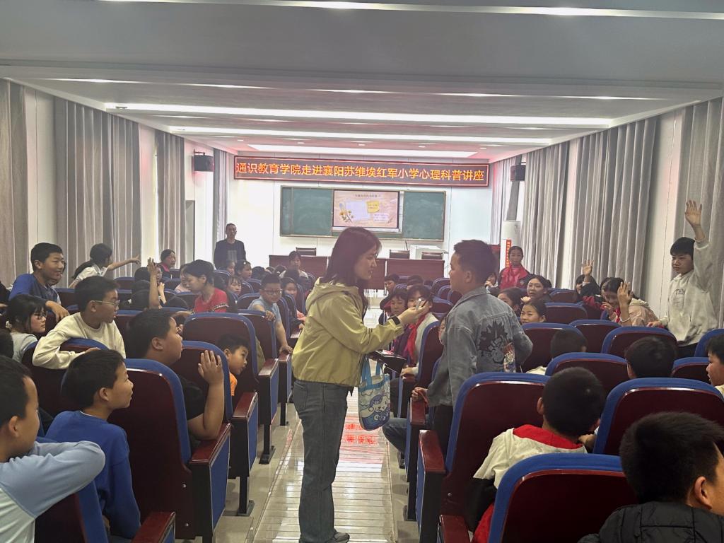 针对小学生心理需求,通识教育学院还为襄阳苏维埃红军小学的5、6年级学生们带来了“闪闪发光的我”主题心理健康讲座,通过案例分享、互动游戏等形式,引导孩子们认识情绪、接纳自我,教授简单实用的情绪调节方法,用耐心与温暖守护孩子们心灵健康成长。